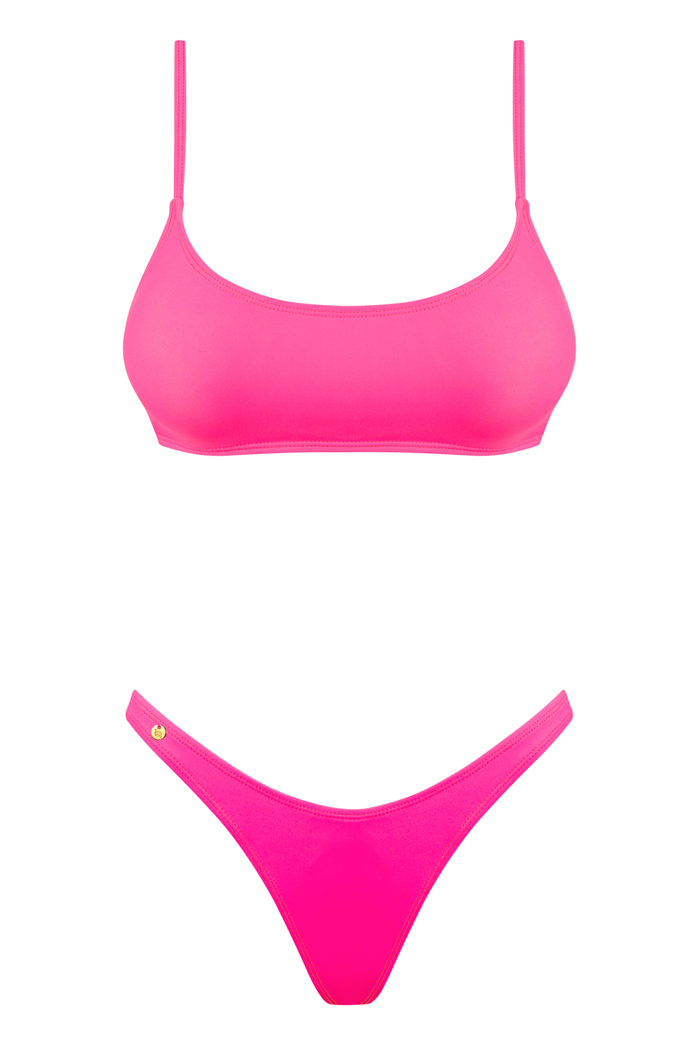 Aufregender Bikini in knalligem Neonpink. Das sportliche Oberteil mit verstellbaren Trägern und Rückenverschluss betont die Brust. Das Unterteil im 90er-Jahre-Stil setzt Beine und Po perfekt in Szene. Elastisches und schnell trocknendes Material.