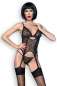 Verführerische Corsage in einer Kombination aus durchscheinendem Mesh und wunderschön gemusterter Spitze mit einem glitzernden Schmuckanhänger. Mit schmalen Trägern und Strumpfhaltern sowie einem mehrstufigen Rückenverschluss für eine perfekte Passform. Vertikale Nähte am Bauch schmeicheln Ihrer Figur, Ausschnitte unter der Brust und am Rücken lassen Ihre Haut durchblitzen. Passende Strümpfe und Spitzen-String inklusive.