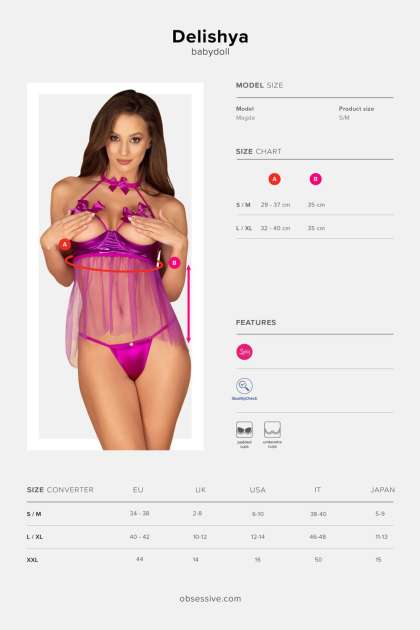 Einzigartiges, violettes Babydoll in einem Mix aus glänzendem Metallic-Material und transparentem Tüllmaterial. Mit Halsband, offenen Bügel-Cups und süßen Schleifen. Mit verstellbarem Rückenverschluss und elastischen, verstellbaren Trägern. Passender String mit Schmuckdetail inklusive.