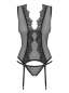 Feminine Corsage aus transparentem und elastischem Mesh. Mit einem einzigartigen Spitzenmotiv, das sich atemberaubend von den Schultern bis zur Hüfte erstreckt. Mit einer phänomenalem Rückenschnürung und verstellbaren Strumpfhaltern. Klassischer, schwarzer String inklusive. Die abgebildeten "S800 Stockings schwarz" sind nicht im Lieferumfang enthalten und separat erhältlich.