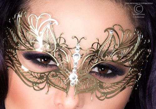 Diese geheimnisvolle Maske aus Messing ist verziert mit glitzernden Kristallen. Sie lässt sich mit Satinbändern festbinden und perfekt anpassen.