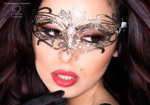 Diese geheimnisvolle Maske aus Messing ist verziert mit glitzernden Kristallen. Sie lässt sich mit Satinbändern festbinden und perfekt anpassen.