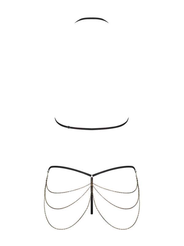 Wunderschönes Dessous-Set aus elastischem Material. Bestehend aus einem verstellbaren Neckholder-BH, einem String und abnehmbaren Zierketten.